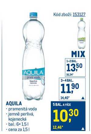 AQUILA prvni vode pramenitá voda jemně perlivá, kojenecká bal 6×1,5l cena za 1,5l