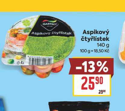 Aktuální slevu na Aspikový čtyřlístek 140 g zjistíte jednoduše nastavením Strážce slev .