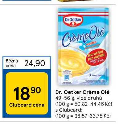 Běžná cena 24,90 18.⁹⁰ 90 Clubcard cena Dr.Oetker CremeOle bez va Peni bez varenia 3 3 re Dr. Oetker Crème Olé 49-56 g, více druhů (100 g = 50,82-44,46 Kč) s Clubcard: (100 g 38.57-33.75 Kč)