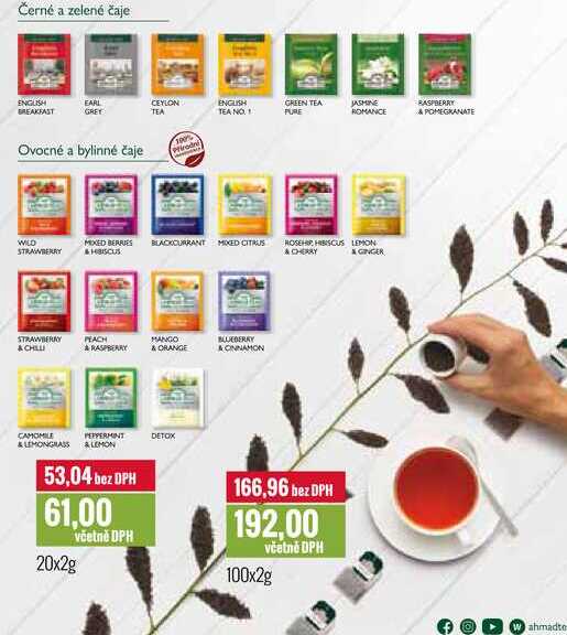 Černé a zelené čaje / Ovocné a bylinné čaje , různé druhy 20x2 g 61 / 100x2g 192