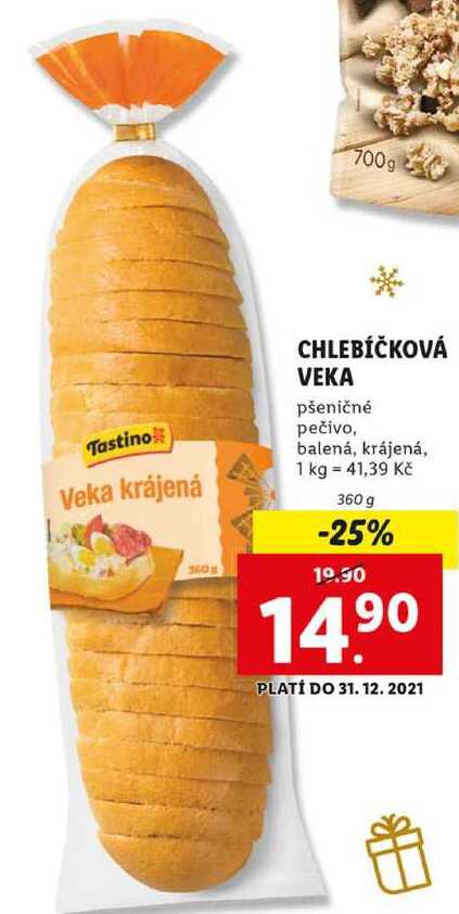 Aktuální slevu na CHLEBÍČKOVÁ VEKA pšeničné pečivo, balená, krájená, 360 g zjistíte jednoduše nastavením Strážce slev .