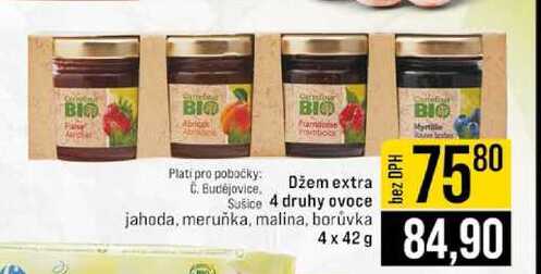 Aktuální slevu na Džem 4 druhy ovoce jahoda, meruňka, malina, borůvka 4 x 42 g zjistíte jednoduše nastavením Strážce slev .