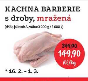 Aktuální slevu na KACHNA BARBERIE droby, mražená (třída jakosti: A, váha: 3400 g/3600 g) 1kg zjistíte jednoduše nastavením Strážce slev .
