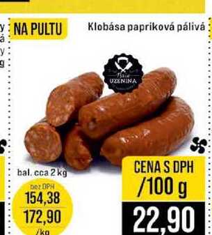 Aktuální slevu na Klobása papriková pálivá 2 kg 100g zjistíte jednoduše nastavením Strážce slev .