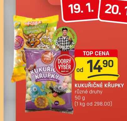 Aktuální slevu na KUKUŘIČNÉ KŘUPKY různé druhy 50 g zjistíte jednoduše nastavením Strážce slev .
