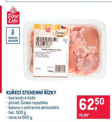 Aktuální slevu na KUŘECÍ STEHENNÍ ŘÍZKY bez kosti a kůže původ Česká republika baleno v ochranné atmosféře bal 500 g cena za 500 g zjistíte jednoduše nastavením Strážce slev .