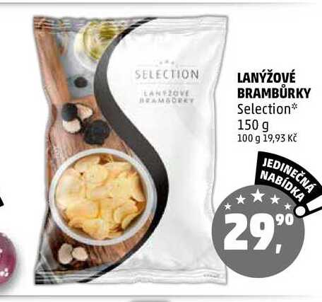 Aktuální slevu na LANÝŽOVÉ BRAMBŮRKY Selection, 150 g zjistíte jednoduše nastavením Strážce slev .
