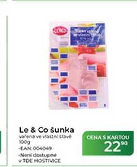 Aktuální slevu na Le & Co šunka vařená ve vlastní šťávě 100g zjistíte jednoduše nastavením Strážce slev .