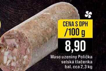 Aktuální slevu na Maso uzeniny Polička selská tlačenka bal. cca 2,3 kg 100g zjistíte jednoduše nastavením Strážce slev .