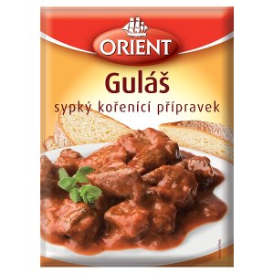 Papriková směs koření, která guláši dodá charakteristickou kořeněnou chuť a výraznou barvu. Hovězí guláš (nákupní lístek pro 6-8 porcí): 1 kg hovězího masa (přední kližky), 2-3 střední cibule, 2 lžíci oleje, 2 lžíce hladké mouky, 50 g rajčatového protlaku, 2 stroužky česneku, sůl, 1 balení ORIENT Guláš. Návod k přípravě: 1. Maso nakrájejte na kostičky. 2. Najemno nakrájenou cibuli osmahněte na oleji, přidejte maso a krátce opečte. Pak přidejte maso a krátce opečte. Pak přidejte celý obsah balení ORIENT Guláš, rajčatový protlak, krátce orestujte a zalijte 1l vody. 3. Maso duste asi 1,5 hodiny, dokud nezměkne. 4. Poté maso vyjměte, šťávu vyduste až na tuk a zaprašte hladkou moukou. Krátce opečte, zalijte znovu vodou, rozšlehejte a nechte provařit. 5. Nakonec přidejte maso, nechte ho prohřát a dle chuti osolte.