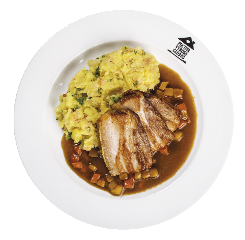 Pomalu pečený vepřový bůček se šťouchanými brambory 200g