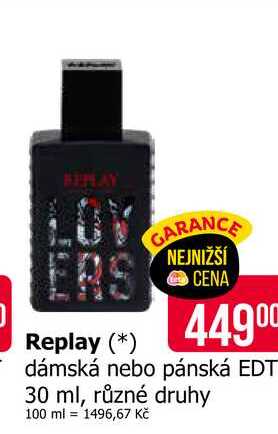 Aktuální slevu na Replay dámská nebo pánská EDT 30 ml, různé druhy zjistíte jednoduše nastavením Strážce slev .