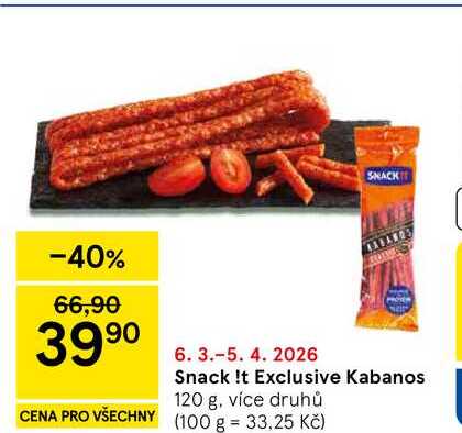 Aktuální slevu na Snack !t Exclusive Kabanos, 120 g zjistíte jednoduše nastavením Strážce slev .