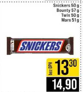 Aktuální slevu na Snickers 50 g Bounty 57 g Twix 50 g Mars 51 g zjistíte jednoduše nastavením Strážce slev .