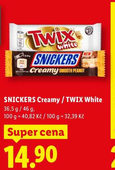 Aktuální slevu na SNICKERS Creamy/TWIX White, 36,5 g/46 g zjistíte jednoduše nastavením Strážce slev .