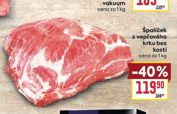 Aktuální slevu na Špalíček z vepřového krku bez kosti cena za 1 kg zjistíte jednoduše nastavením Strážce slev .