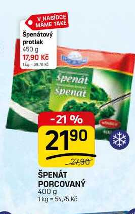 Aktuální slevu na ŠPENÁT PORCOVANÝ 400 g zjistíte jednoduše nastavením Strážce slev .