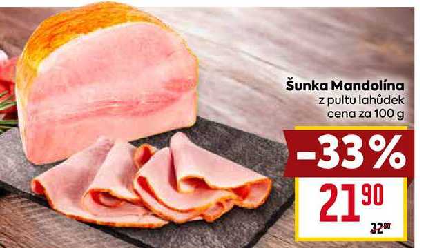 Aktuální slevu na Šunka Mandolina z pultu lahůdek cena za 100 g -33% 2190 3290 zjistíte jednoduše nastavením Strážce slev .