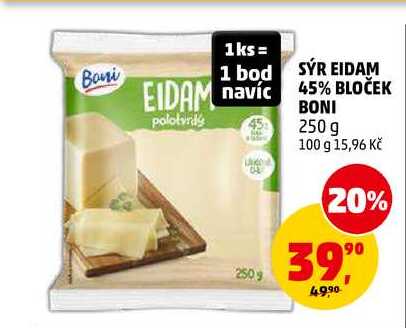 Aktuální slevu na SÝR EIDAM 45% BLOČEK BONI, 250 g zjistíte jednoduše nastavením Strážce slev .