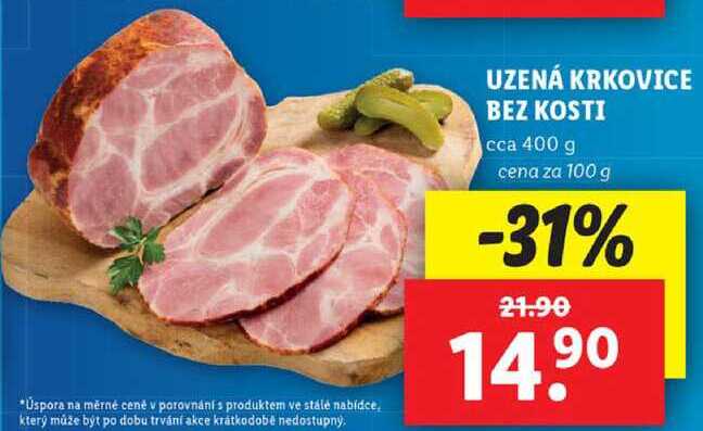 Aktuální slevu na UZENÁ KRKOVICE BEZ KOSTI, cena za 100 g zjistíte jednoduše nastavením Strážce slev .