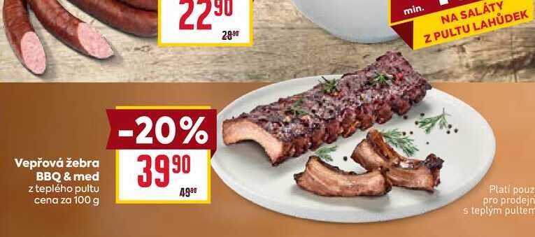 Aktuální slevu na Vepřová žebra BBQ & med z teplého pultu cena za 100 g zjistíte jednoduše nastavením Strážce slev .
