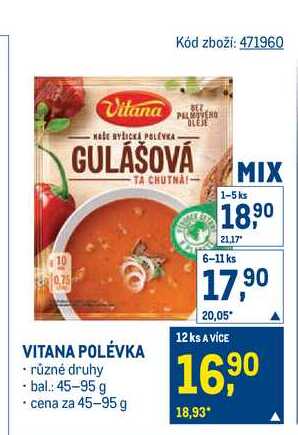 Aktuální slevu na VITANA POLÉVKA různé druhy 45-95 g zjistíte jednoduše nastavením Strážce slev .