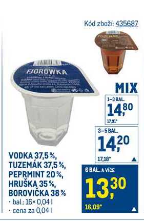VODKA 37,5%, TUZEMÁK 37,5%, PEPRMINT 20%, HRUŠKA 35%, BOROVIČKA 38% bal 16× 0,04l cena za 0,04l