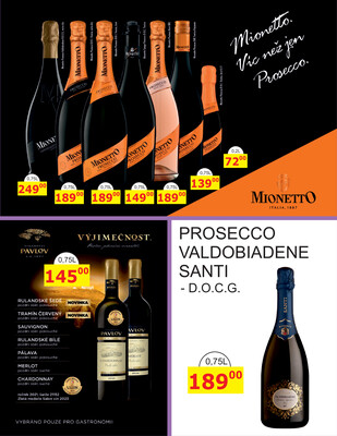 - Mionetto Prosecco Valdobiadene D.O.C.G. 0,75l v akci, za 249 Kč .