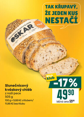 - Slunečnicový kváskový chléb z naší pece 505 g v akci, se slevou 17%, za 49,90 Kč ( Billa Bonus Club).