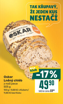 - Oskar Lněný chléb z naší pece 505 g v akci, se slevou 17%, za 49,90 Kč ( Billa Bonus Club).