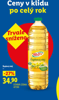 - Řepkový olej, 1 l v akci, se slevou 27%, za 34,90 Kč .