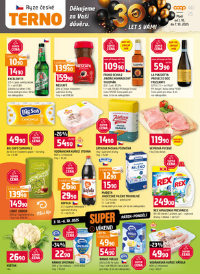 Na 1. stránce letáku Terno České Budějovice, Třeboň, Trhové sviny, Bechyně, Týn nad Vltavou od 1.10. do 7.10.2025 platného od 1.10.2025 do 7.10.2025 najdeme následující zboží v akci.