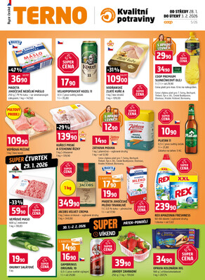 Na 1. stránce letáku Terno České Budějovice, Třeboň, Trhové sviny, Bechyně, Týn nad Vltavou, Borovany od 28.1. do 3.2.2026 platného od 28.1.2026 do 3.2.2026 najdeme následující zboží v akci.