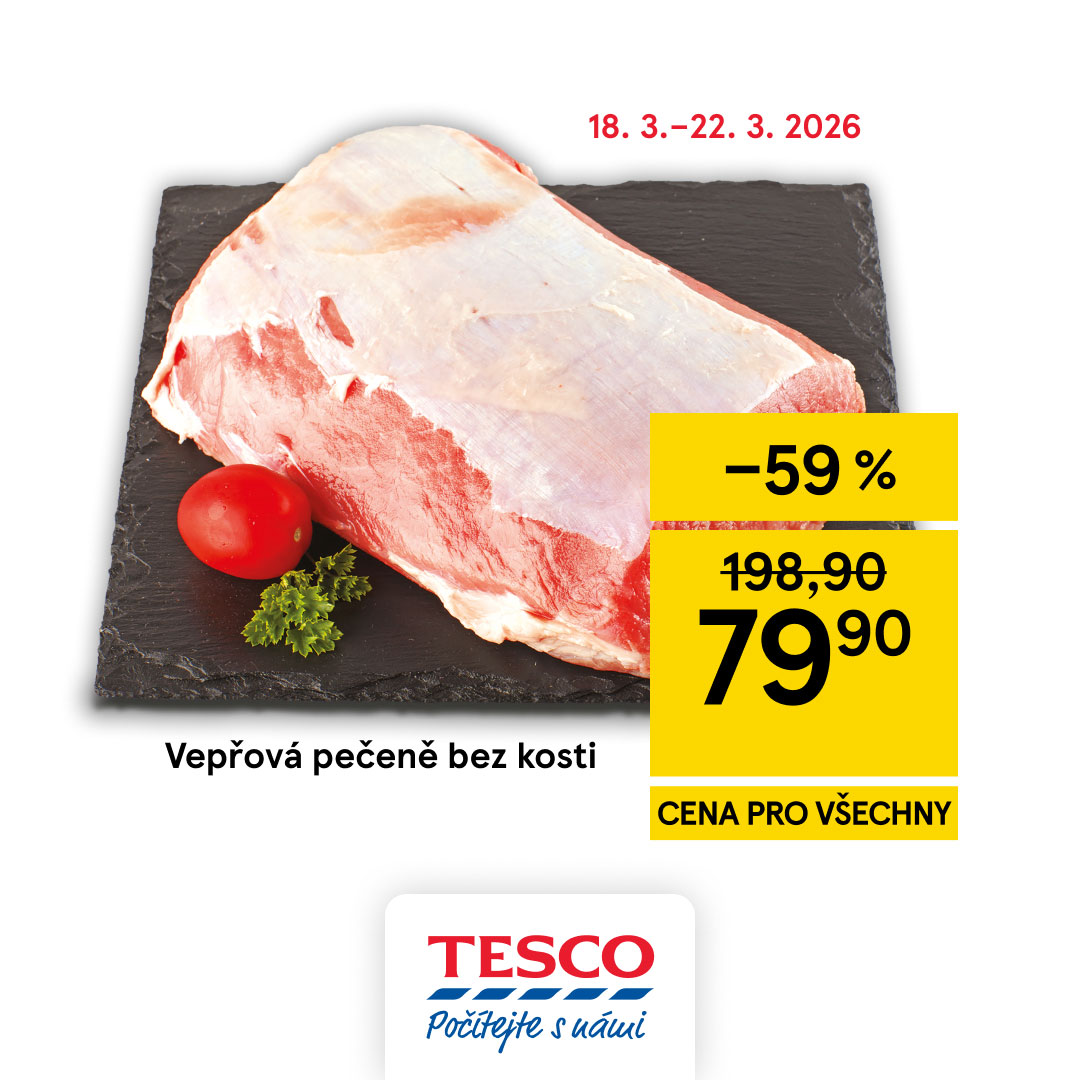 - Tesco Vepřová pečeně bez kosti, 1 kg v akci, s fantastickou slevou 60%, za 79,90 Kč , akce platí od 18.3.2026.