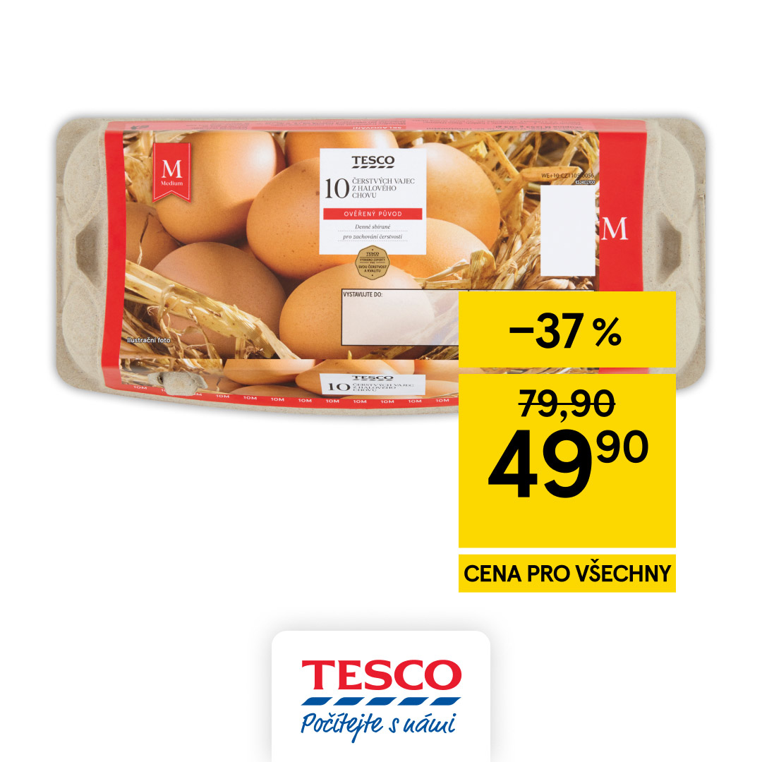 - Tesco Čerstvá vejce M, 10 ks v akci, se slevou 38%, za 49,90 Kč .