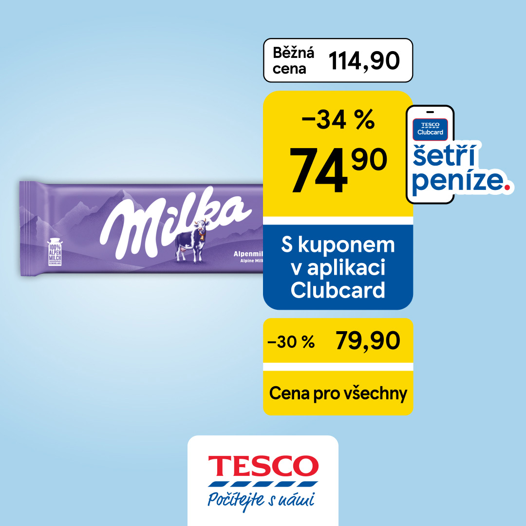 - Milka čokoláda 250g-300g, vybrané druhy v akci, se slevou 30%, za 79,90 Kč .