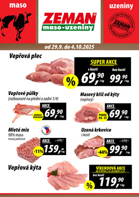Na 1. stránce letáku ZEMAN maso-uzeniny akční leták pro vybrané prodejny druhé skupiny od 29.9. do 4.10.2025 platného od 29.9.2025 do 4.10.2025 najdeme následující zboží v akci.