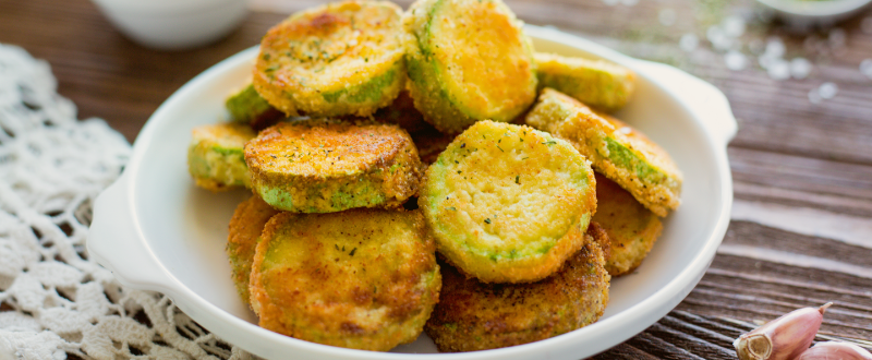 Smažení: Na pánvi rozehřejte olivový olej na střední teplotu. Obalené plátky cukety smažte z obou stran do zlatohněda. Každou stranu smažte přibližně 3-4 minuty.