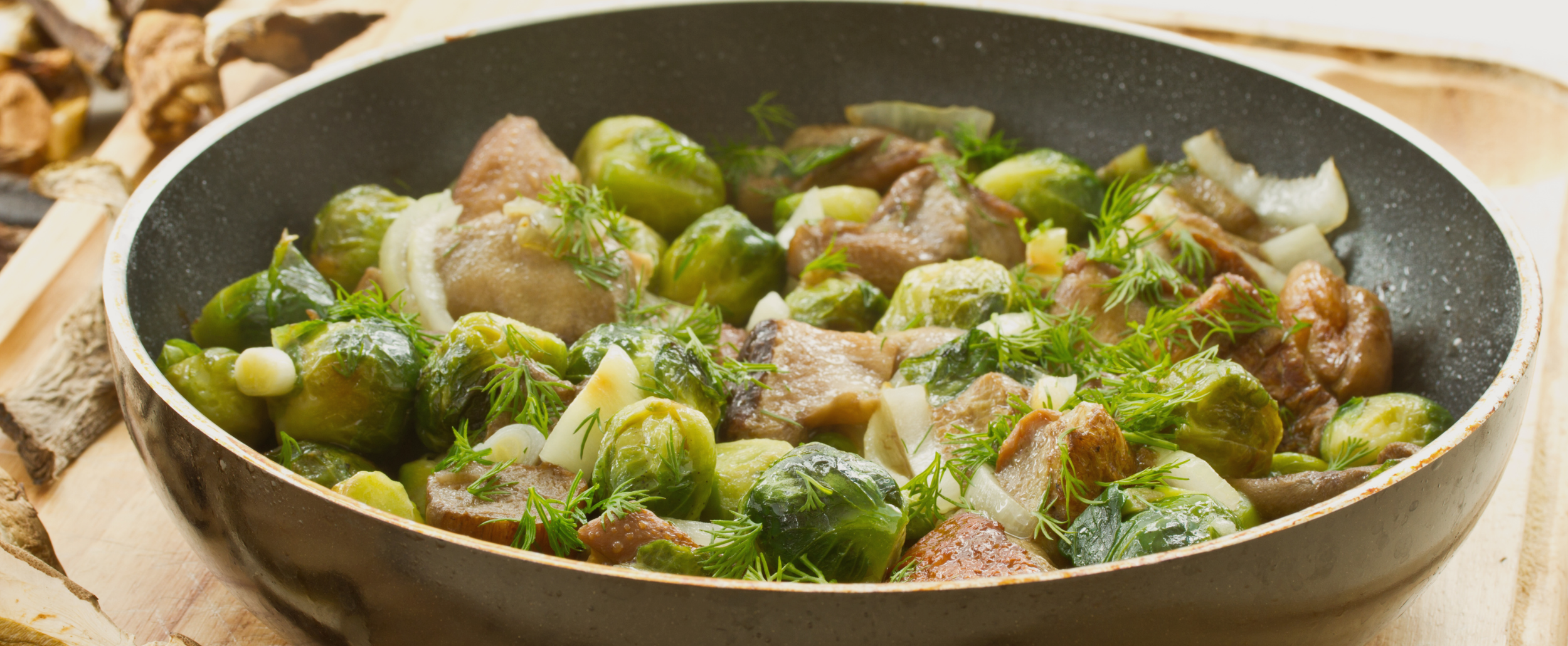 - Přidejte očištěnou růžičkovou kapustu a krátce ji orestujte.