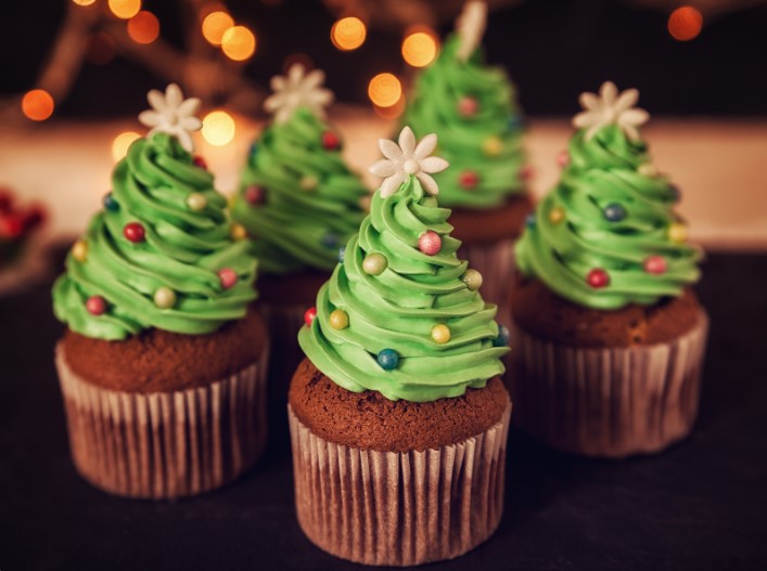 2. Krém: V míse ušlehejte máslo, dokud nezměkne, poté přidejte moučkový cukr a směs neustále míchejte. Přidejte vanilkový extrakt a mléko, dokud nebude směs lehká a krémová. Do polevy přidejte zelené barvivo na koláč a míchejte, dokud poleva nezíská jednotnou barvu. Když jsou cukroví úplně vychladlé, ozdobte je krémem tak, abyste ho nanášeli zvenčí směrem ke středu, abyste vytvořili vánoční stromeček. Ozdobte ho pomocí stříbrných kuliček a hvězdiček a nechte alespoň 30 minut odstát, aby krém vychladl.