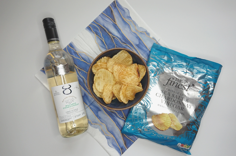 V nabídce značky Tesco Finest najdete také víno – bílé, růžové i červené, a v různých cenových kategoriích (nejlevnější lahve začínají cca na stokoruně). Značku Tesco Finest nesou i výrobky českých a moravských vinařů, do dnešního testu jsem ovšem vybral Chardonnay z oblasti Campo de Borja na severu Španělska, a to hlavně proto, že Chardonnay hraje důležitou roli také v dalším testovaném výrobku. Tím jsou Tesco Finest vroubkované chipsy s příchutí Chardonnay vinného octa a mořskou solí, což je další výrobek, který kupuji dlouhodobě (a jedná se o můj zdaleka nejoblíbenější produkt této značky).