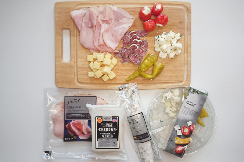 Udělat si hezký večer třeba při sledování vašeho oblíbeného filmu je fajn – ale připravit si k tomu ještě obložený talíř je Finest. Na talíř (nebo v tomto případě na prkno) jsem vybral čtyři výrobky Tesco Finest, a to uzenou šunku s kmínem, vyzrálý britský West Country Farmhouse Cheddar, salám Fuet a středomořský výběr předkrmů (obsahující sýr feta s bylinkami a dva druhy nakládaných papriček plněných smetanovým sýrem).
