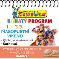 Od pátku 1. března do neděle 3. března 2019 bude v Merlin´s Kinderwelt obchodního centra Excalibur City probíhat Masopustní víkend. Na kluky a holky tu čeká speciální hravý program, jež nabídne výrobu papírových masek, které využijete i na tamním karnevalu. Chybět nebude ani sladká tečka, a to v podobě koblížku ke každému jídlu v Merlin´s Bistru zdarma.